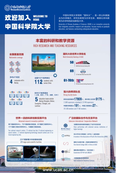 UCAS is committed to the “Integration of Research and Education”, under the administration and management of Chinese Academy of Sciences (CAS), China's highest academic institution and national think tank in science and technology, and the national strategic force in basic research and integrated high-tech development. UCAS is deeply integrated with CAS research institutes, observatories, and centers (hereinafter referred to as “training units”) in faculty, education and research. UCAS has four campuses in Beijing, five off-Beijing education centers, and more than 110 training units across China.